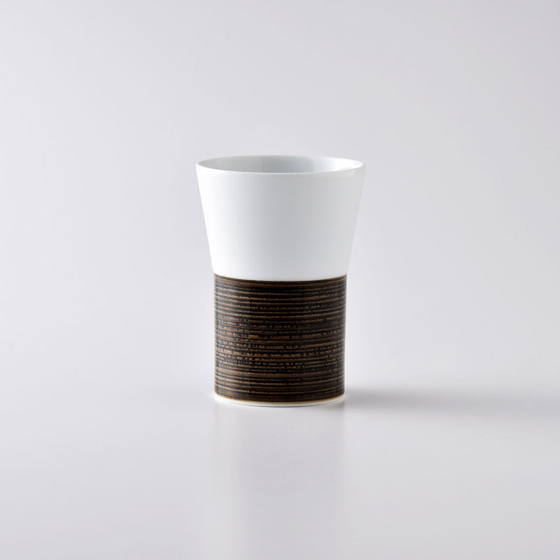 麻糸のような深い色あいと白磁の対比が新鮮です。