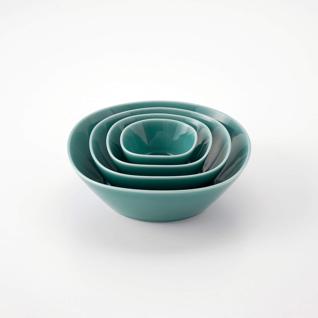白磁、青磁、つや紺の和の艶めきを持つ表情は、洗練されたフォルムと響きあい、和洋を問わず幅広い料理に自然となじみ、色の取りあわせも楽しめます。